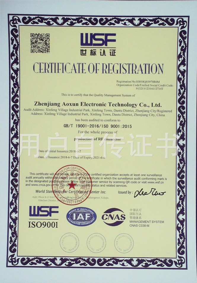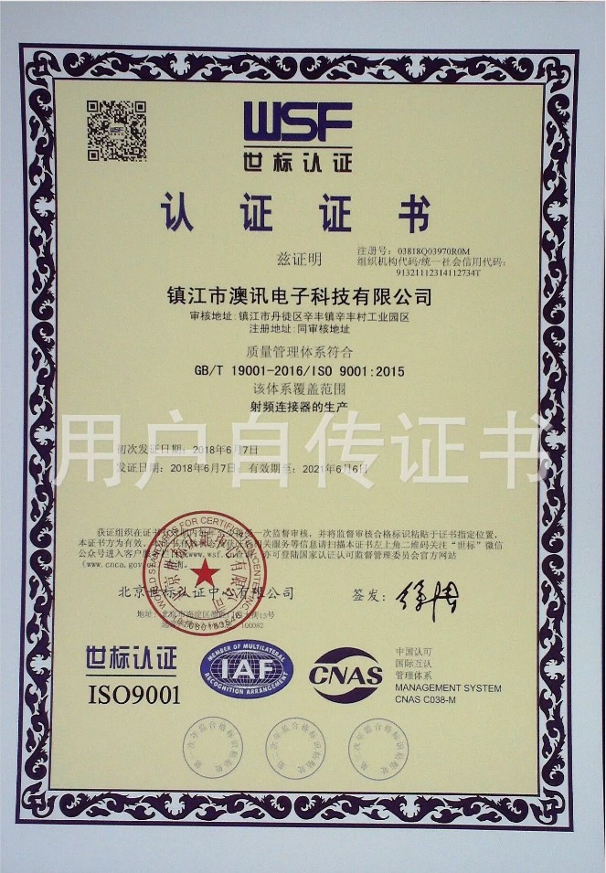 鎮江市澳訊電子科技有限公司,占地面積5000平方米,現有員工近百名,各類技術人員占15%。我公司專業從事射頻同軸連接器的設計、研制、開發、生產、銷售。
